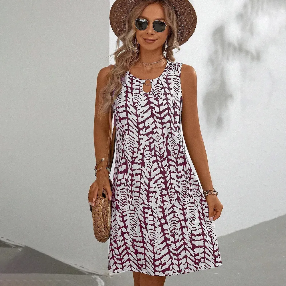 Women Fashion Casual Boho Flower Printed Sleeveless Loose Dress