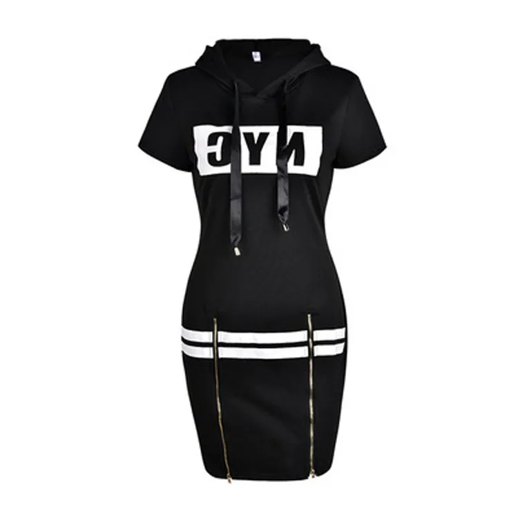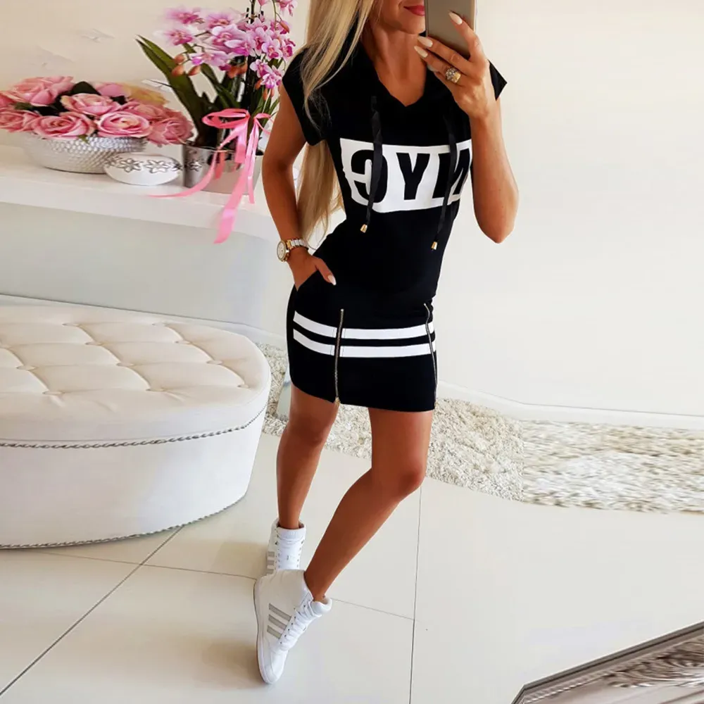 Women Fashion Casual Letter Print Short-Sleeve Hooded Slim-Fit Dress