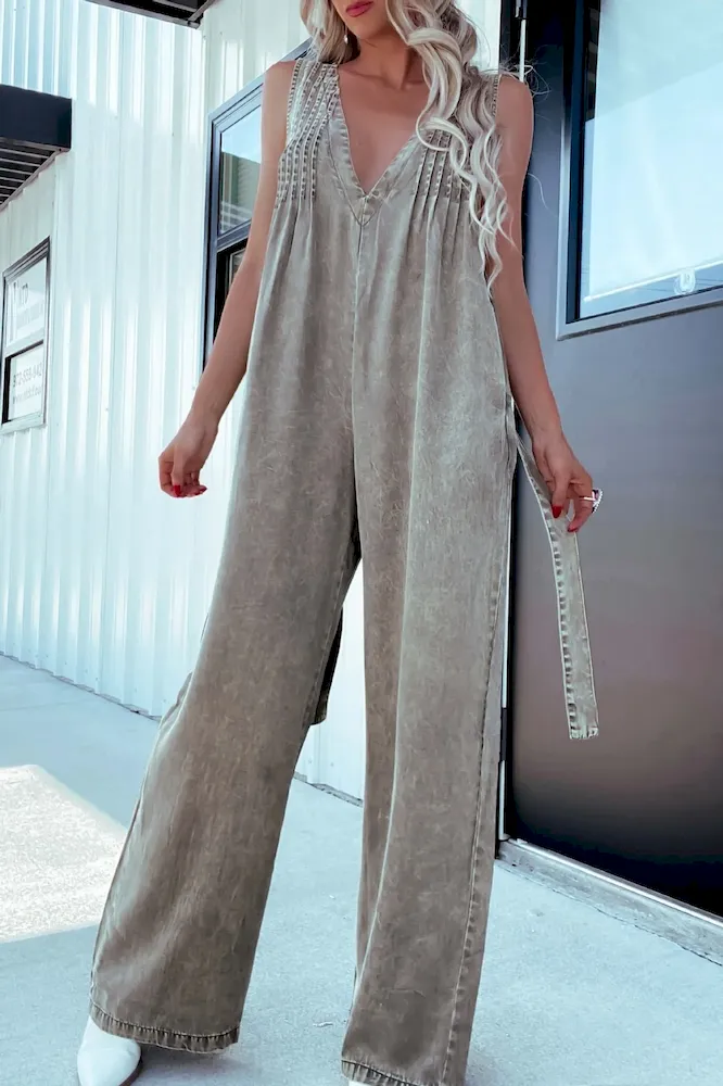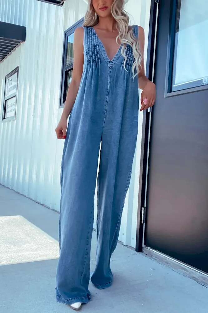 Women Fashion Casual Pleated V-Neck Sleeveless Backless Denim Jumpsuits