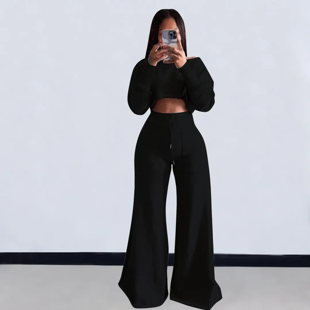 Women Fashion Casual Solid Color Long-Sleeve Crop Top Slim-Fit Pants Two-Piece Set