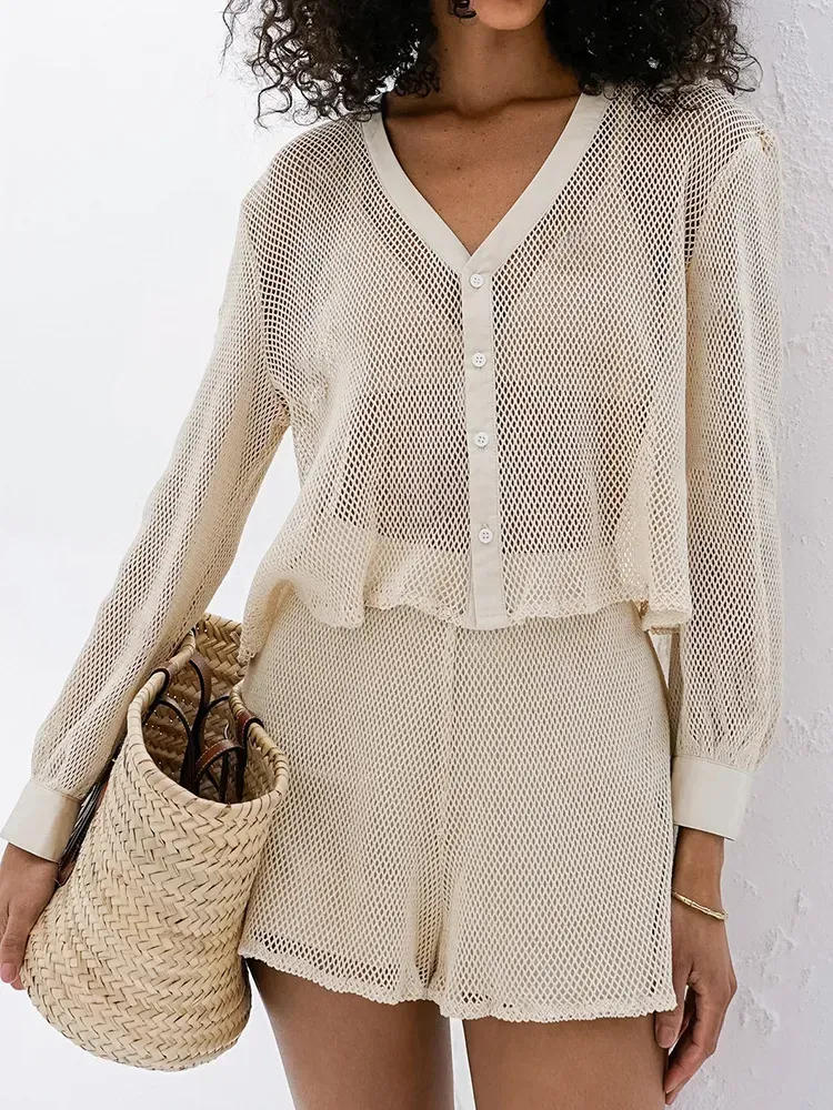 Women Fashion Mesh V-Neck Long Sleeve Top Shorts Two-Piece Set
