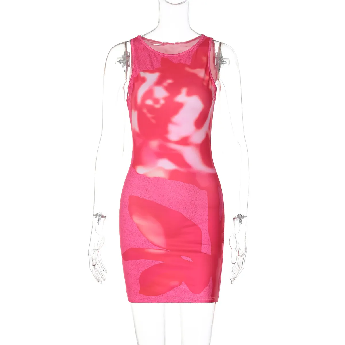 Women Fashion Sexy Digital Printing Round Neck Sleeveless Slim Fit Dress