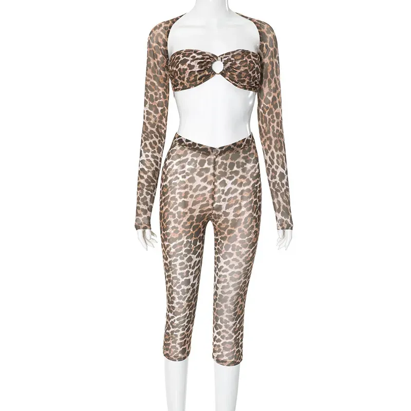Women Fashion Sexy Leopard Mesh See-Through Long Sleeve Lace-Up Crop Top Slim Fit Shorts Two-Piece Set